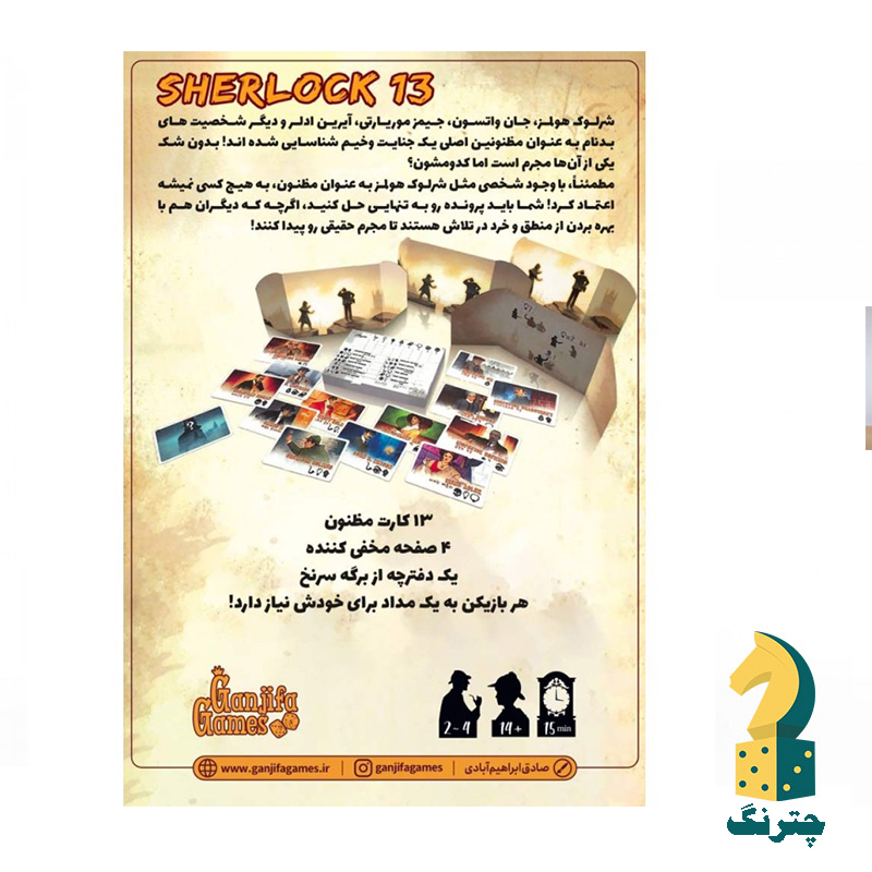 در بازی شرلوک 13 شما باید از بین 13 مجرم بازی تشخیص دهید کدوم فرد مسئول جرم مرتکب شده است برای شروع بازی یه کارت از 13 کارت مظنونین رو از بازی خارج کنین وسط بازی بگذارید