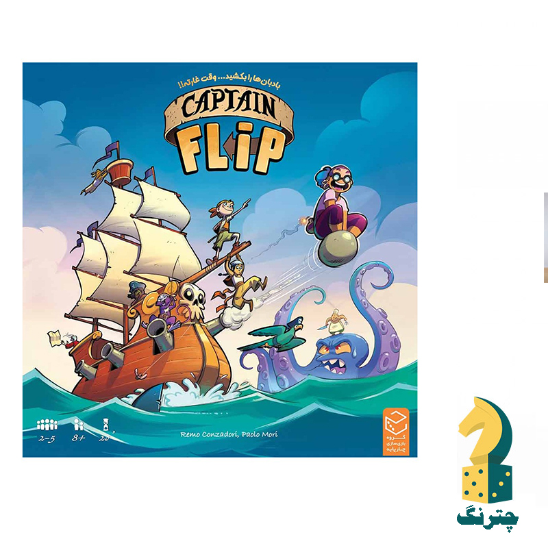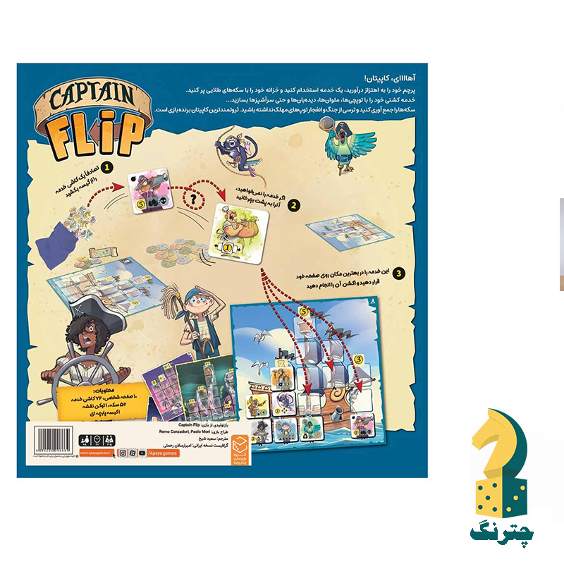 جزییات بازی ایرانی کاپیتان فلیپ Captain Flip برگردانی از بازی خارجی Captain Flip یک بازی خانوادگی سبک و جذاب نامزد بهترین بازی سال 2024 رقابت در کشتی دزدان دریایی برای جمع کردن طلای بیشتر! ثروتمندترین کاپیتان برنده بازی است! مناسب 2 الی 5 بازیکن زمان بازی: 30 الی 45 دقیقه 8 سال به بالا محصولی از گروه چارپایه