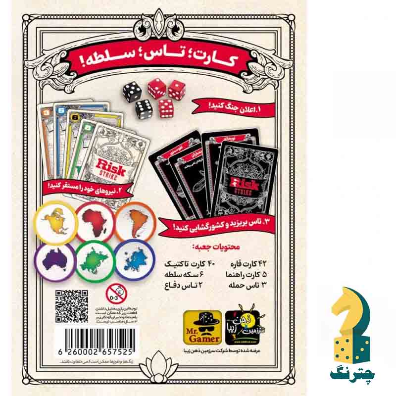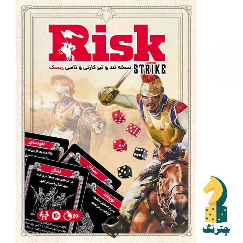 جزییات بازی فکری ریسک یک بازی قدیمی و محبوب است که این بازی نسخه‌ی کارتی آن می‌باشد که از بازی خارجی Risk Strike گرفته شده است. نسخه‌ی متفاوت و سریع از یک بازی نوستالژیک. برای سلطه‌ی بر دنیا با یکدیگر بجنگید. نیرو‌های خود را آماده نبرد سازید. تاس بریزید و مناطق مختلف را در تصرف خود درآورید تا در انتها حاکم کل دنیا شوید!