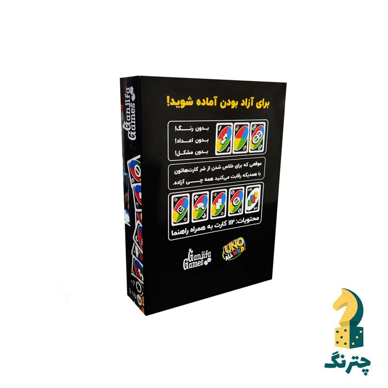 بازی فکری گنجیفا «اونو آل وایلد»، نسخه ای جدید از بازی فکری و محبوب اونو uno برای آزاد بودن آماده شوید! بدون رنگ، بدون اعداد – بدون مشکل! سراسر کل کل و خنده، تعداد 112 کارت با کارت های جدید و قدرت های خاص! Uno در زبان های ایتالیایی و اسپانیایی به معنای یک می باشد که در بازی دسته جمعی اونو نیز هدف بازی رسیدن به تک کارت و در نهایت استفاده از آن کارت و برنده شدن می باشد. اونو UNO یک بازی کارتی سرگرم کننده و آسان برای یادگیری است که بیش از 40 سال است که ابداع شده و طرفداران زیادی به خود جذب کرده است. این بازی توسط مرل رابینز طراحی شد. لازم به ذکر است که این بازی جز بازیهای کارتی محبوب در سطح جهان است.